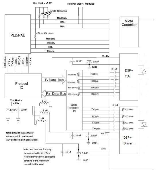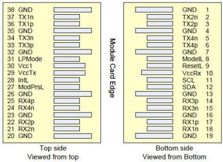 ١. GND هو رمز الإشارة ومصدر الطاقة (التغذية) المشترك لوحدة QSFP28. جميعها مشتركة داخل الوحدة، وتُنسب جميع جهود الوحدة إلى هذا الجهد ما لم يُذكر خلاف ذلك. قم بتوصيلها مباشرةً بمستوى التأريض المشترك للإشارة على اللوحة المضيفة.