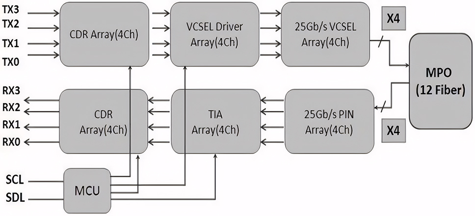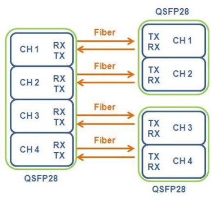 كابل QSFP28 إلى 2x QSFP28 النشط الضوئي هو نوع من أجهزة الإرسال والاستقبال المتوازية. وتُعد تقنية VCSEL وحزمة مصفوفة PIN أساسية، حيث يمكن الاتصال بالوحدة عبر نظام I2C.