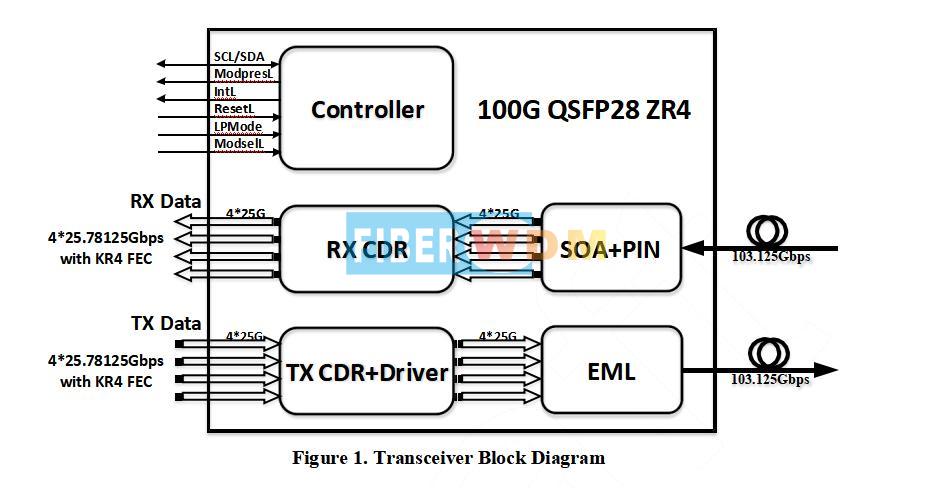 تقنية الألياف الضوئية WDM QSFP28 100G ZR4 صُممت وحدة RQ-100G-ZR4 لتطبيقات الاتصالات الضوئية لمسافة 80 كيلومترًا. تحتوي هذه الوحدة على مُرسِل ضوئي رباعي المسارات، ومُستقبِل ضوئي رباعي المسارات، ووحدة إدارة تتضمن واجهة تسلسلية ثنائية الأسلاك. تُجمَّع الإشارات الضوئية على ليف أحادي النمط عبر موصل LC قياسي. يوضح الشكل 1 مخططًا توضيحيًا للوحدة.