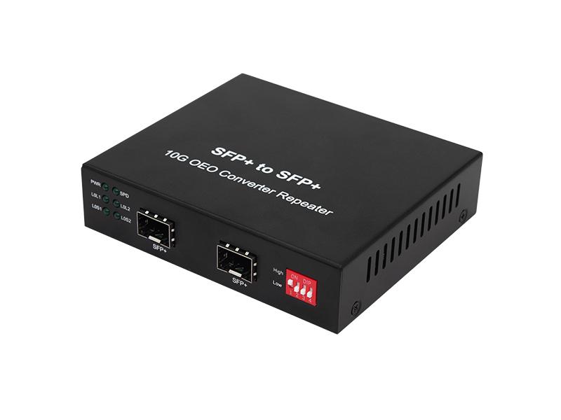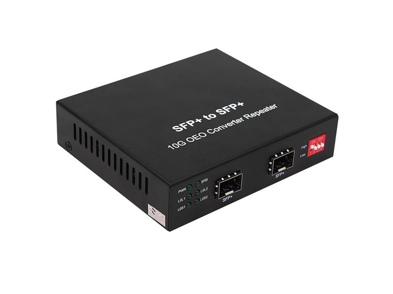 محول 10G هو وصلة بين أجهزة الألياف الضوئية بسرعة 10 جيجابت في الثانية، ويعمل كمحول وسائط ألياف ضوئية أو كمكرر ألياف لنقل البيانات لمسافات طويلة. يدعم OEO العمود الفقري للشبكة (SAN، LAN، MAN). يدعم SDH/SONET STM-64/OC-192، وقناة ألياف 10G، وإيثرنت 10G، وغيرها. يمكن استخدامه في غرف الاتصالات، ومختبرات البحث والتطوير، ومراكز البيانات، وغيرها. يوفر تحويلًا للأطوال الموجية الضوئية 1310 نانومتر/1550 نانومتر/CWDM/DWDM.