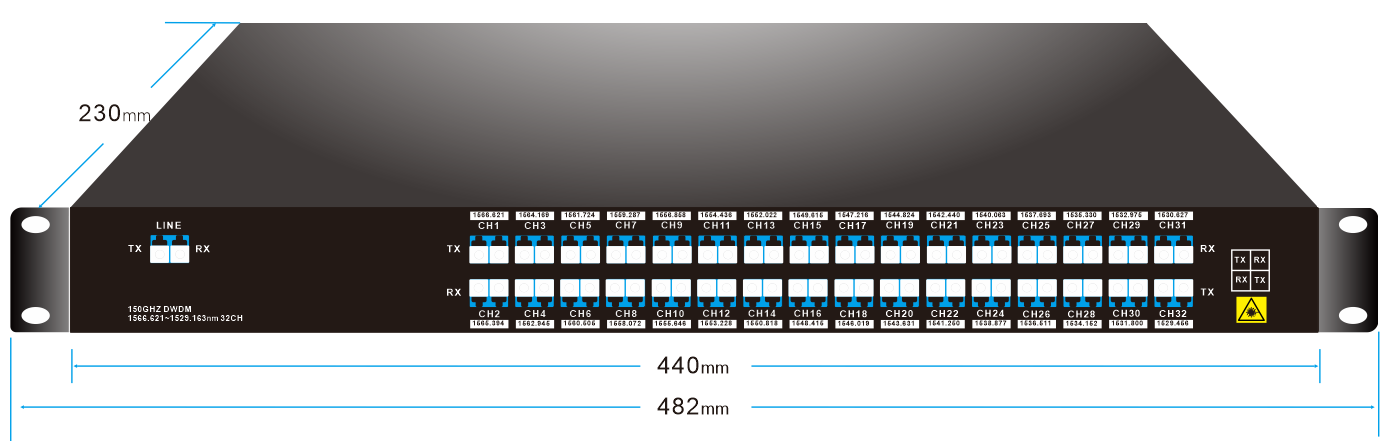 مُضاعِف/مُزيل إرسال DWDM بتردد 150 جيجاهرتز، 32 قناة (1566.007~1529.163 نانومتر)، ألياف ضوئية مزدوجة، LC/UPC، وحدة رف 1U |