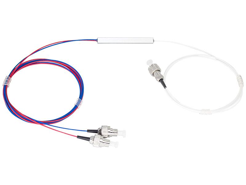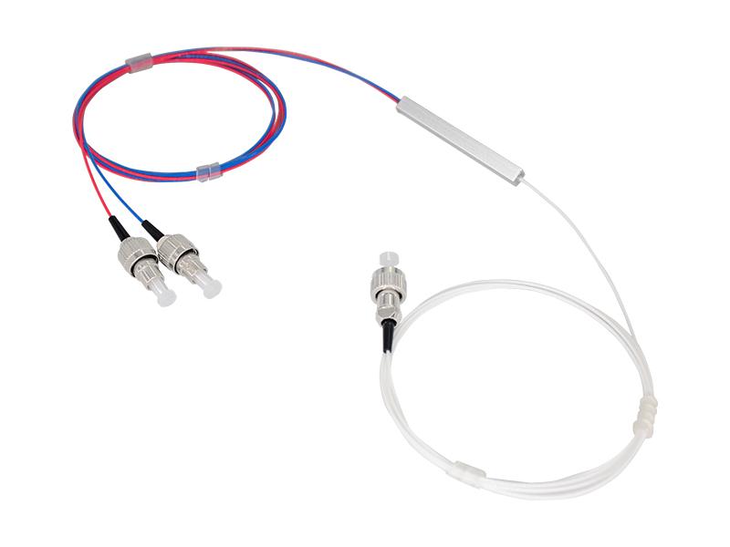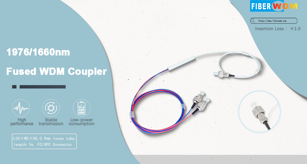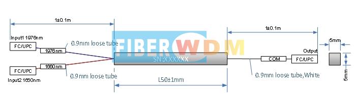 مُقترن WDM مُدمج بتردد 1976/1660 نانومتر، أبعاد العبوة: الطول 50 × العرض 5 × الارتفاع 5، أنبوب فضفاض بقطر 0.9 مم، طوله 1 متر، موصل FC/UPC