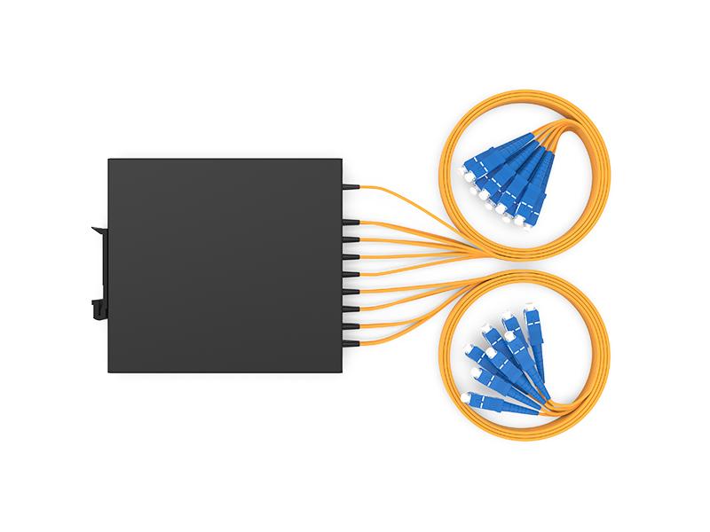 صندوق تركيب DIN مزود بـ 16 منفذ PLC SC/UPC 2.0 مم و1.0 متر من الألياف الضوئية، أبعاده 120 × 110 × 20 مم
