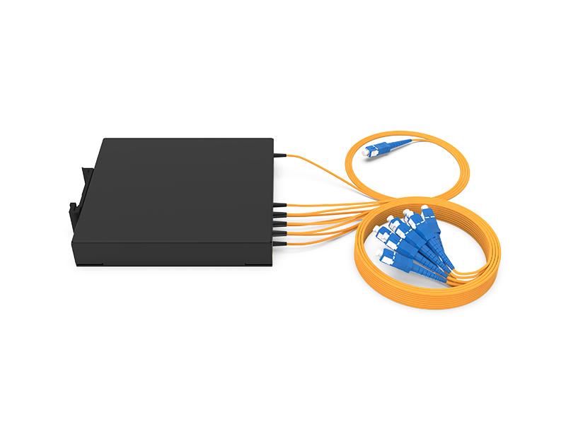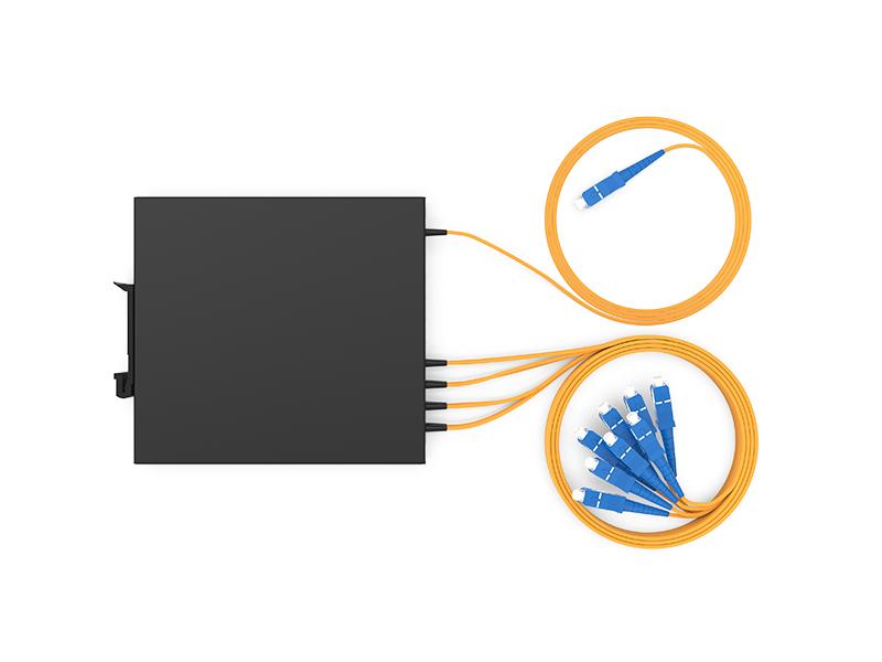 صندوق تركيب DIN مزود بـ 1x8 وحدة تحكم منطقية قابلة للبرمجة (PLC) من نوع SC/UPC، كابل ألياف ضوئية 2.0 مم بطول 1.0 متر، أبعاده 120 × 110 × 20 مم