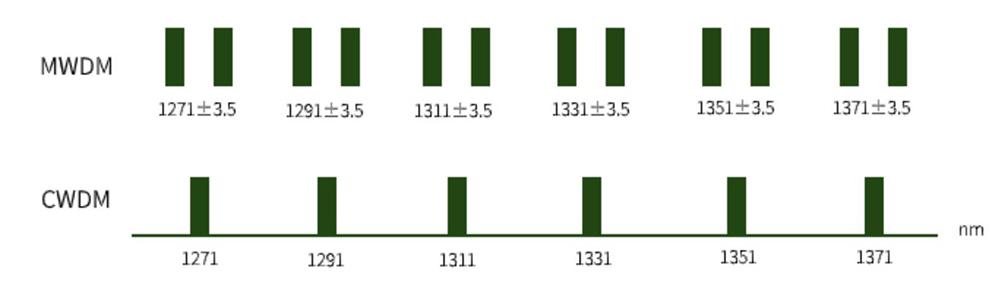 تعتمد تقنية MWDM على تقنية CWDM ذات 6 موجات، وتمتد الإزاحات اليسرى واليمنى عند 3.5 نانومتر إلى 12 موجة (1267.5، 1274.5، 1287.5، 1294.5، 1307.5، 1314.5، 1327.5، 1334.5، 1347.5، 1354.5، 1367.5، 1374.5 نانومتر)؛