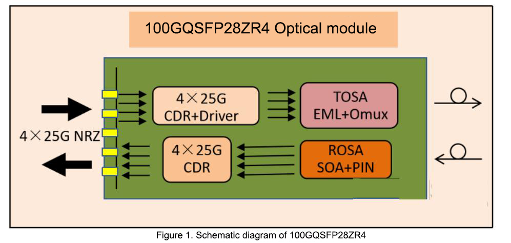 منفذ QSFP28 ZR4/eZR4 بسرعة 100 جيجابت في الثانية على جانب الإرسال، و4 منافذ NRZ بسرعة 25 جيجابت في الثانية بالإضافة إلى وحدة استعادة البيانات. على جانب الاستقبال، مضخم إشارة بصرية + منفذ PIN؛ تعدد الإرسال/فك تعدد الإرسال عبر تقنية LWDM (أطوال موجية مركزية 1296 نانومتر، 1300 نانومتر، 1305 نانومتر، و1309 نانومتر على التوالي)، واجهة بصرية LC قياسية؛ نقل عبر ألياف أحادية النمط ثنائية النواة.