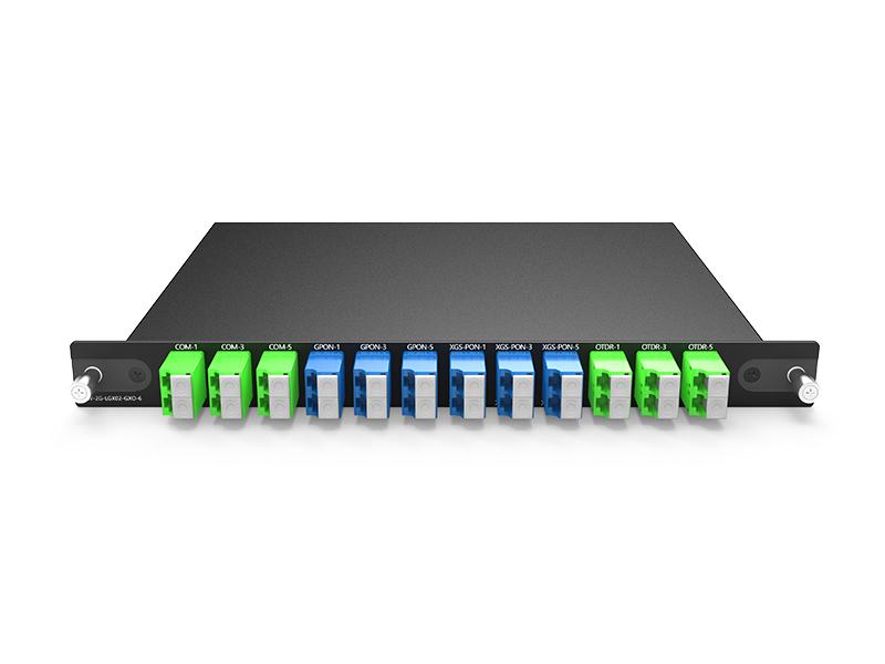 صندوق LGX قابل للتوصيل، 6 قنوات WDM GPON XGS-PON وOTDR، PON LC/UPC، COM وOTDR LC/APC، أبعاده 215 × 150 × 20 مم |