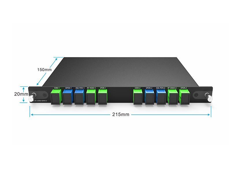 صندوق LGX قابل للتوصيل، 4×4 قنوات، بتقنية WDM GPON XGS-PON، مزود بفيديو RF وجهاز OTDR، وPON LC/UPC، وCOM RF Video OTDR LC/APC، بأبعاد 215×150×20 مم