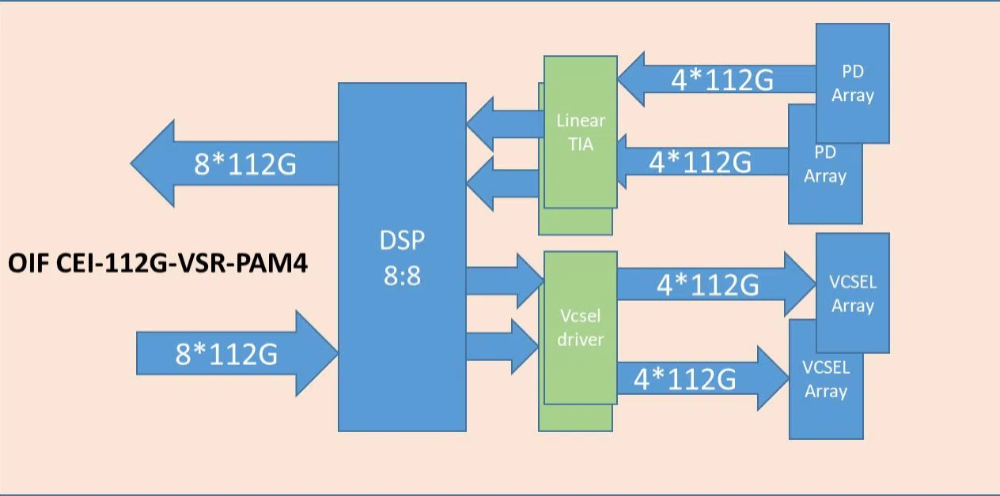 من جانب جهاز الاستقبال، تقوم الوحدة بتحويل 8 قنوات من الإشارات الضوئية المتوازية بسرعة 100 جيجابت/ثانية لكل قناة للحصول على معدل بيانات إجمالي يبلغ 800 جيجابت/ثانية إلى 8 قنوات من بيانات الإخراج الكهربائي بسرعة 100 جيجابت/ثانية (PAM4).