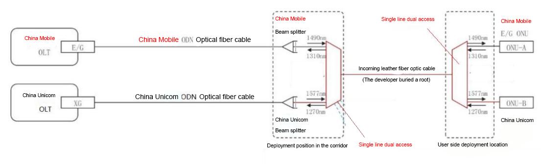 يعتمد هذا المخطط على خط واحد ووصول مزدوج ، بغض النظر عما إذا كان الهاتف المحمول مشمولاً بشبكة EPON/GPON أو 10G EPON (النوع المتناظر) / يمكن تفعيل قنوات XGPON 1491/1310 أو 1577/1270 عبر تقنية "الوصول المزدوج بخط واحد" لتوفير اتصال متزامن بالإنترنت عبر الهاتف المحمول والإنترنت المنزلي. وذلك لتلبية احتياجات المستخدمين المتعددين في غرفة واحدة، أو المستخدمين المتعددين في غرفة واحدة، أو حتى توفير خدمة الإنترنت المنزلي في غرفة واحدة قبل انتهاء صلاحية الخدمة، مع إمكانية التوصيل/التحويل السريع للشبكة.