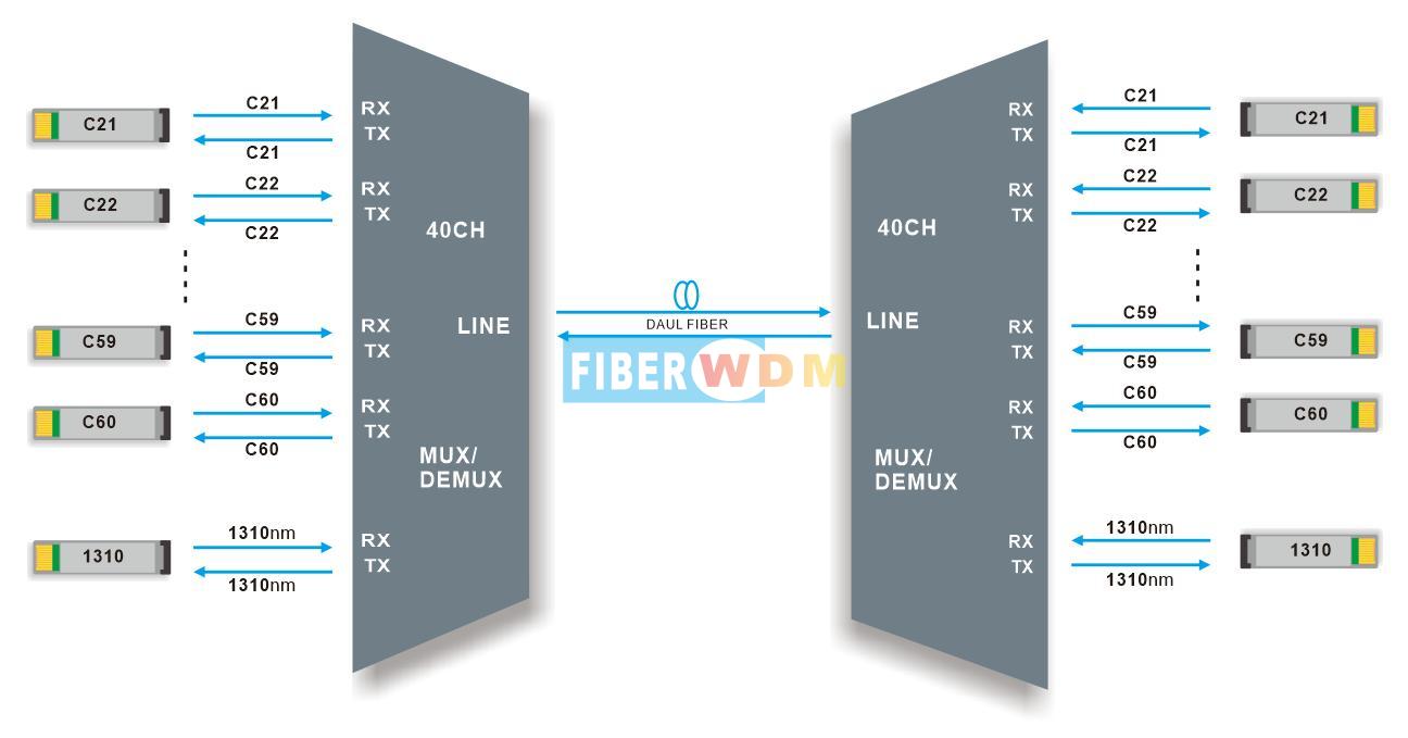 يعمل نظام DWDM ذو 40 قناة، والمُزوّد بمنفذ 1310 نانومتر، ضمن نطاق أطوال موجية من C21 إلى C60 (1560.61 نانومتر ~ 1529.55 نانومتر)، وفقًا لشبكة ITU-T G.694.1 بتردد 100 جيجاهرتز، مما يُحسّن من سعة نطاق C. وهو جهاز DWDM سلبي بالكامل، يدعم فقدًا منخفضًا للإدخال (أقل من 3.5 ديسيبل لمنافذ الأطوال الموجية، وأقل من 0.8 ديسيبل لمنفذ 1310 نانومتر). وبالاقتران مع مُضخّمات DWDM وجهاز DCM، يُمكن لنظام نقل DWDM ذو 40 قناة دعم الإرسال لمسافات طويلة.