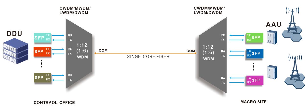 في أنظمة الربط الأمامي لشبكات الجيل الرابع والخامس، يُعدّ استخدام الألياف الضوئية مباشرةً لتوصيل وحدات RRU وDDU أمرًا بسيطًا، ولكنه يستهلك كمية كبيرة من موارد الألياف الضوئية، والتي غالبًا ما تكون شحيحة. في هذه الحالة، يُمكن استخدام نظام CWDM لتوفير موارد الألياف.