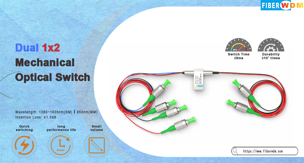 يقوم مفتاح الألياف الضوئية المزدوج 1x2 بتوصيل القنوات الضوئية عن طريق توجيه أو حجب الإشارة الضوئية الواردة إلى ألياف الإخراج. ويتحقق ذلك باستخدام تصميم كهروضوئي ميكانيكي قيد براءة الاختراع، ويتم تفعيله عبر إشارة تحكم كهربائية. يحافظ الإصدار المزود بآلية تثبيت على المسار الضوئي المحدد بعد إزالة إشارة التشغيل، بينما تعود الإصدارات غير المزودة بآلية تثبيت إلى حالة الفتح أو الإغلاق عند انقطاع الطاقة. مفتاح بصري ميكانيكي يحتوي على مستشعرات كهربائية مدمجة لتحديد الموضع. يقلل التصميم المتقدم الجديد القائم على المواد بشكل كبير من حساسية موضع الأجزاء المتحركة، مما يوفر استقرارًا عاليًا غير مسبوق وتكلفة منخفضة لا مثيل لها.