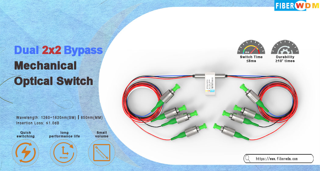 يقوم مفتاح الألياف الضوئية الميكانيكي ثنائي التجاوز 2x2 بتوصيل القنوات الضوئية عن طريق توجيه أو حجب الإشارة الضوئية الواردة إلى ألياف الإخراج. ويتحقق ذلك باستخدام تصميم كهروضوئي ميكانيكي قيد الحصول على براءة اختراع، ويتم تفعيله عبر إشارة تحكم كهربائية. يحافظ الإصدار المزود بآلية تثبيت على المسار الضوئي المحدد بعد إزالة إشارة التشغيل، بينما تعود الإصدارات غير المزودة بآلية تثبيت إلى حالة الفتح أو الإغلاق عند فصل الطاقة. مفتاح الألياف الضوئية الميكانيكي يحتوي على مستشعرات كهربائية مدمجة لتحديد الموضع. يقلل التصميم المتقدم الجديد القائم على المواد بشكل كبير من حساسية موضع الأجزاء المتحركة، مما يوفر استقرارًا عاليًا غير مسبوق وتكلفة منخفضة لا مثيل لها.