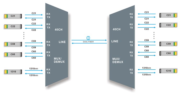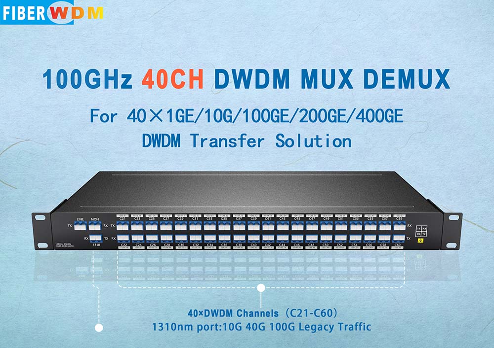 جهاز DWDM ذو 40 قناة مع منفذ 1310 نانومتر هو جهاز DWDM سلبي تمامًا، ويدعم فقدًا منخفضًا للإدخال (منافذ الطول الموجي < 3.5 ديسيبل؛ منفذ 1310 نانومتر < 0.8 ديسيبل). وعند اقترانه بمضخمات DWDM وجهاز DCM، يمكن لنظام نقل DWDM ذو 40 قناة دعم الإرسال لمسافات طويلة.