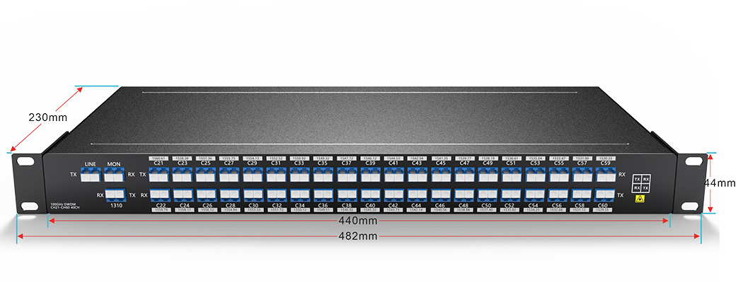 تم تصميم جهاز DWDM MUX DEMUX ذو 40 قناة بواسطة FIBERWDM، بطول موجي من C21 إلى C60 (1560.61 نانومتر ~ 1529.55 نانومتر)، وفقًا لشبكة ITU-T G.694.1 100 جيجاهرتز، مما يزيد من سعة نطاق النطاق C.