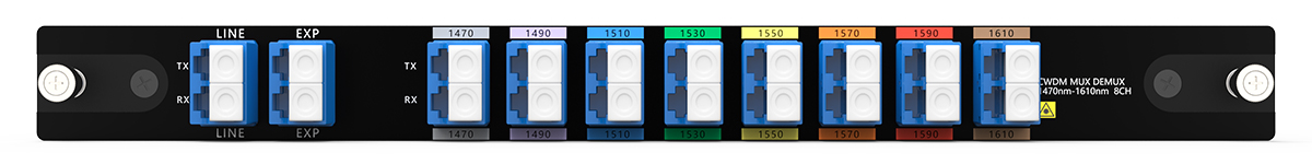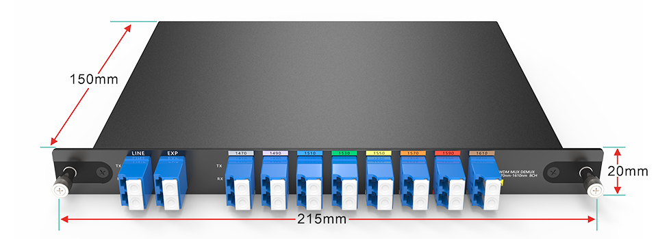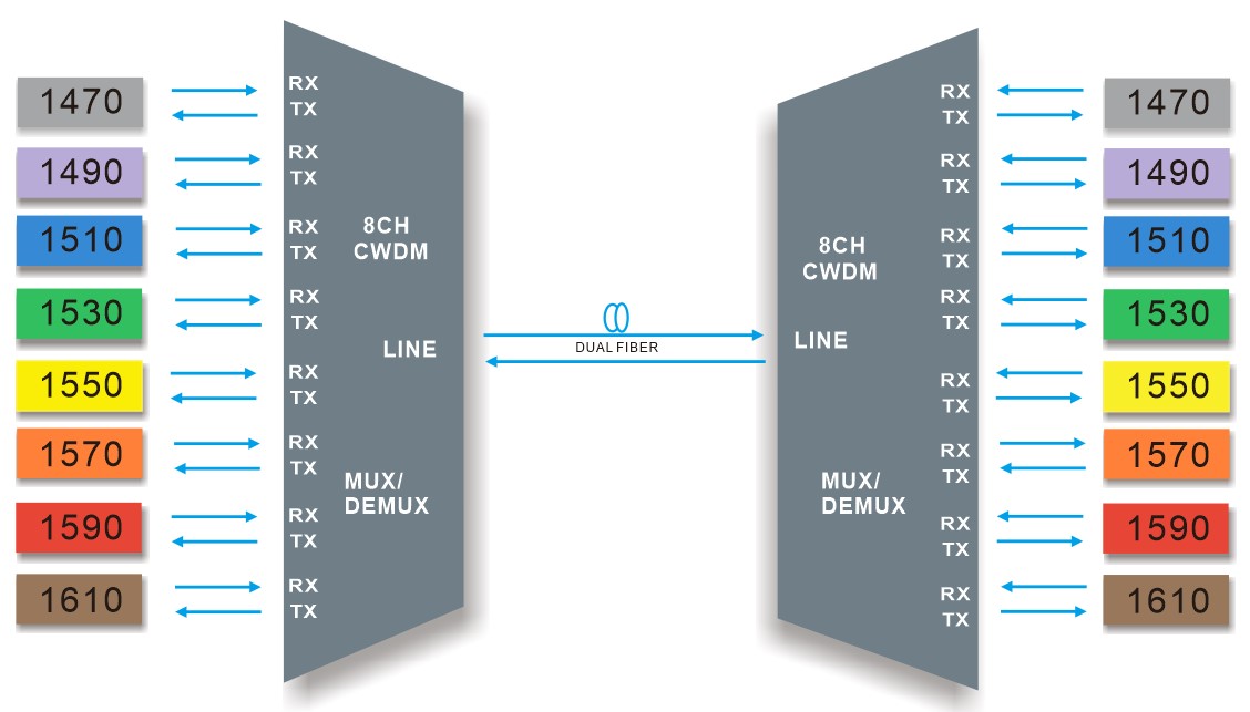 جهاز CWDM MUX DEMUX ذو 8 قنوات، يدعم 8 قنوات مختلفة، مثل تطبيقات مثل 1G/10G Ethernet وSDH/SONET و8/4/2/1G، في اثنين من الألياف الضوئية للإرسال من نقطة إلى نقطة.