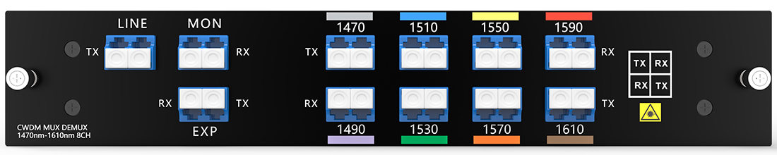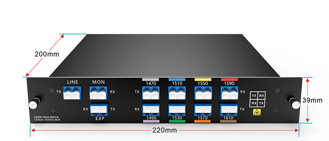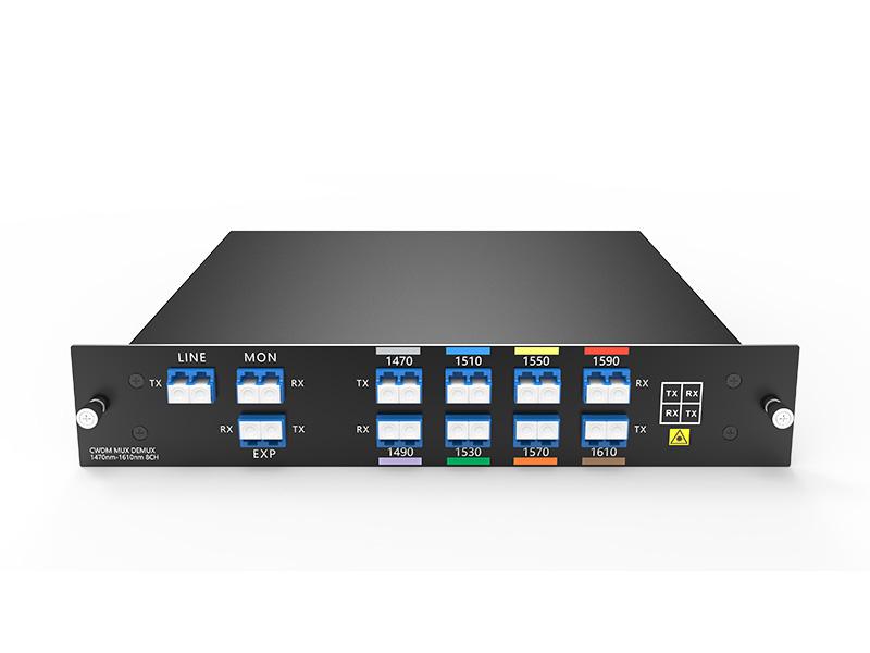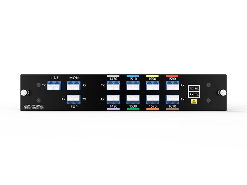 جهاز CWDM MUX DEMUX ذو 8 قنوات، يدعم 8 قنوات مختلفة، مثل تطبيقات مثل 1G/10G Ethernet وSDH/SONET و8/4/2/1G، في اثنين من الألياف الضوئية للإرسال من نقطة إلى نقطة.