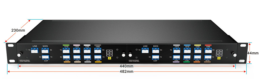 تم تصميم جهاز CWDM MUX DEMUX ذو 8 قنوات بواسطة FIBERWDM، بطول موجي من 1470 نانومتر إلى 1610 نانومتر، وهو جهاز CWDM سلبي وصندوق LGX قابل للتوصيل، ويمكن توصيله برف 1U ذي فتحتين، ويدعم 8 قنوات مختلفة في ليفين بصريين للإرسال من نقطة إلى نقطة.