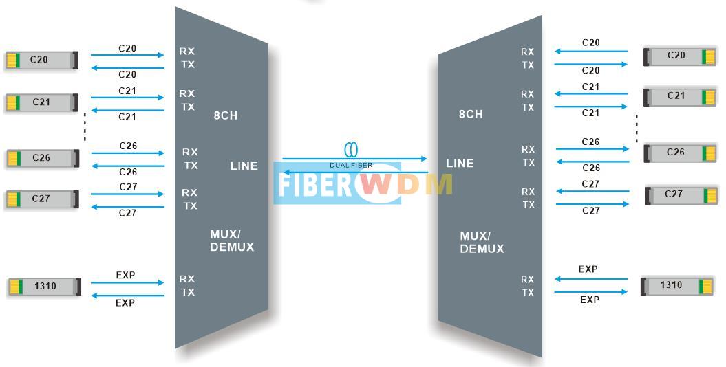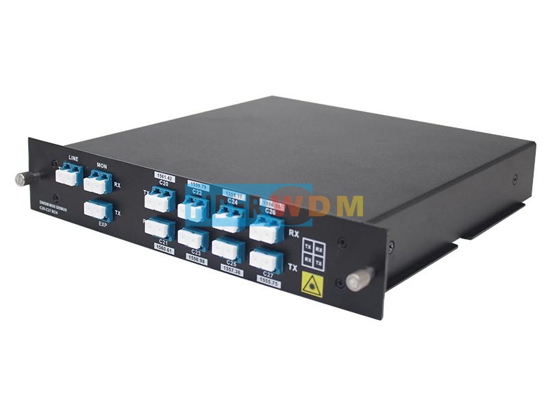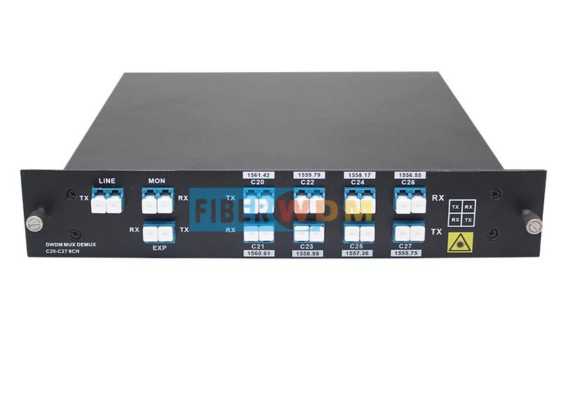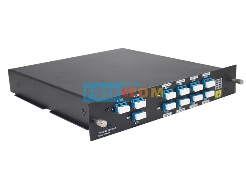 وحدة DWDM ذات 8 قنوات هي وحدة سلبية تمامًا من نوع LGX، ويمكن تركيبها في رف 1U ذي فتحتين؛ ويبلغ فقد الإدخال للمنتج أقل من 2.4 ديسيبل. وعند ربطها بمضخمات DWDM وجهاز DCM، يمكن لنظام نقل DWDM ذي 8 قنوات دعم الإرسال لمسافات طويلة.