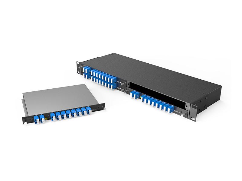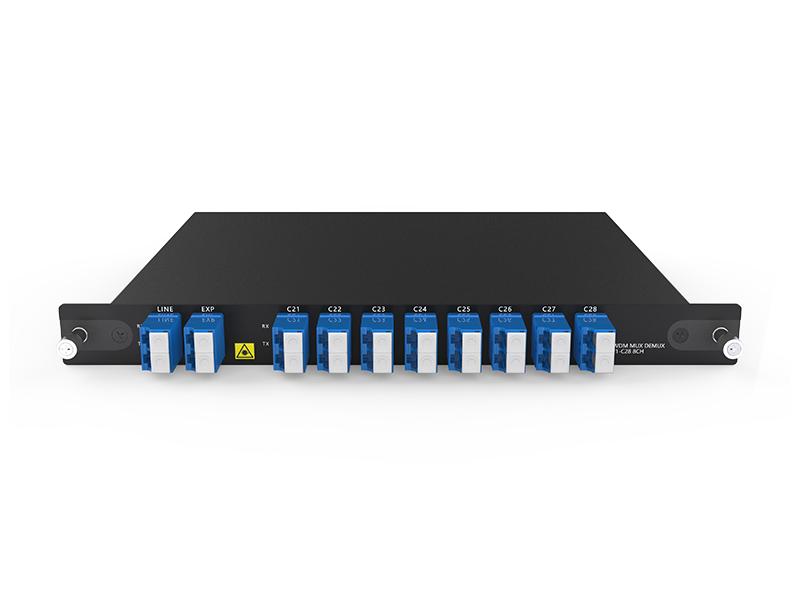 وحدة DWDM MUX/DEMUX ذات 8 قنوات هي وحدة سلبية تمامًا من نوع LGX، ويمكن تركيبها في رف 1U ذي 4 فتحات. يبلغ فقد الإدخال للمنتج: (منافذ الطول الموجي < 2.4 ديسيبل؛ فقد الخط < 3.2 ديسيبل). وعند دمجها مع مضخمات DWDM وجهاز DCM، يدعم نظام نقل DWDM ذو 8 قنوات الإرسال لمسافات طويلة.