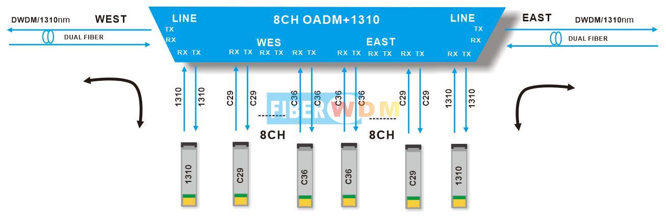 يدعم إضافة وحذف 8 قنوات DWDM وقناة واحدة لنقل الأعمال 1310 نانومتر في الألياف المزدوجة.