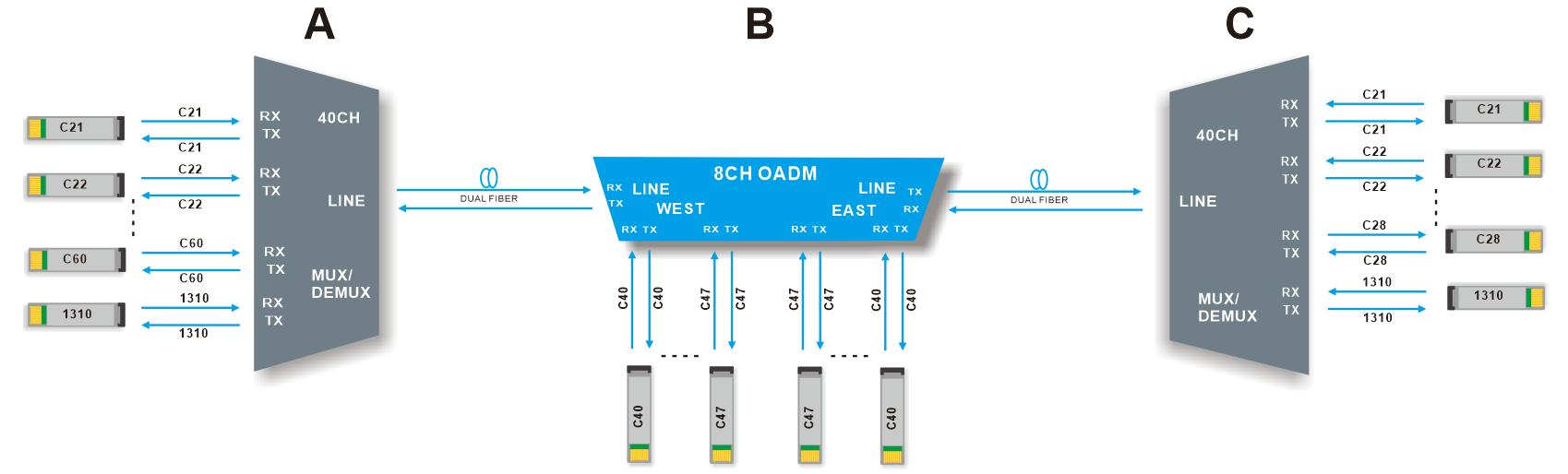 يحتوي الاتصال من A إلى C على 32 قناة DWDM وقناة إرسال أعمال واحدة بتردد 1310 ميجاهرتز عبر ليفين ضوئيين، بينما يحتوي الاتصال من A إلى B ومن B إلى C على 8 قنوات إرسال أعمال عبر ليفين ضوئيين. في الجانب B، يتم حذف 8 قنوات وإضافة 8 قنوات أخرى عبر ليفين ضوئيين.