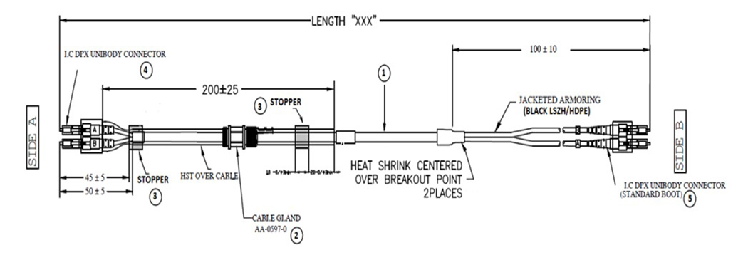 الكابل الرئيسي مُدرّع، وكابل فرعي بقطر 2.0 مم، أحد طرفي الفرع غير مُدرّع ومزود بحلقة بلاستيكية M28 وسدادات. أما الطرف الآخر (الطرف ب) فهو فرع مُدرّع بشبكة من الكيفلار لزيادة قوة الشد.