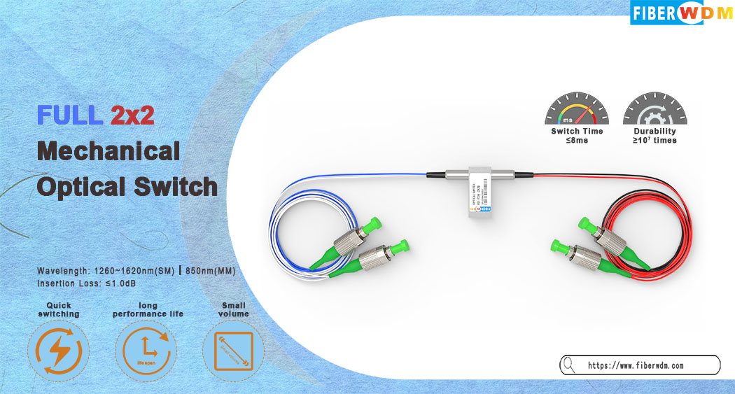 يقوم مفتاح الألياف الضوئية الكامل 2x2 بتوصيل القنوات الضوئية عن طريق توجيه أو حجب الإشارة الضوئية الواردة إلى ألياف الإخراج. ويتحقق ذلك باستخدام تصميم كهروضوئي ميكانيكي قيد الحصول على براءة اختراع، ويتم تفعيله عبر إشارة تحكم كهربائية. يحافظ الإصدار المزود بآلية تثبيت على المسار الضوئي المحدد بعد إزالة إشارة التشغيل، بينما تعود الإصدارات غير المزودة بآلية تثبيت إلى حالة الفتح أو الإغلاق عند فصل الطاقة. مفتاح الألياف الضوئية الميكانيكي يحتوي على مستشعرات كهربائية مدمجة لتحديد الموضع. يقلل التصميم المتقدم الجديد القائم على المواد بشكل كبير من حساسية موضع الأجزاء المتحركة، مما يوفر استقرارًا عاليًا غير مسبوق وتكلفة منخفضة لا مثيل لها.