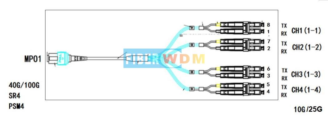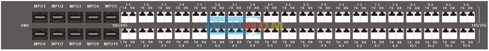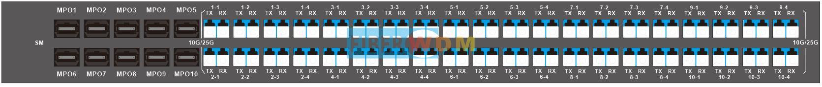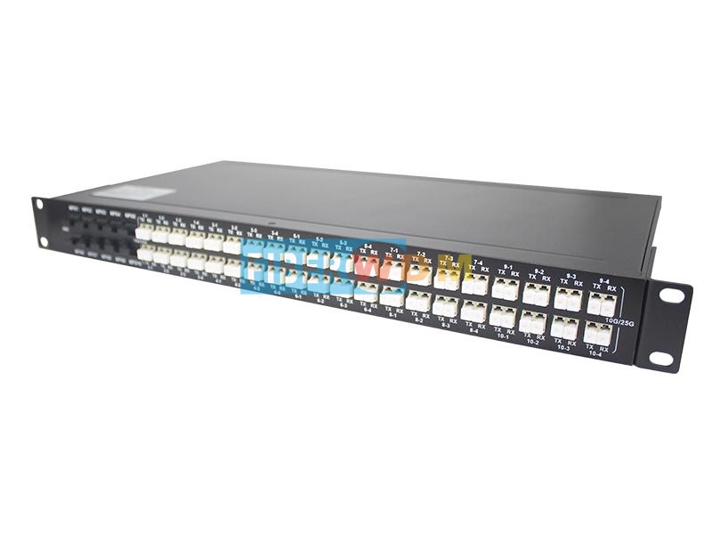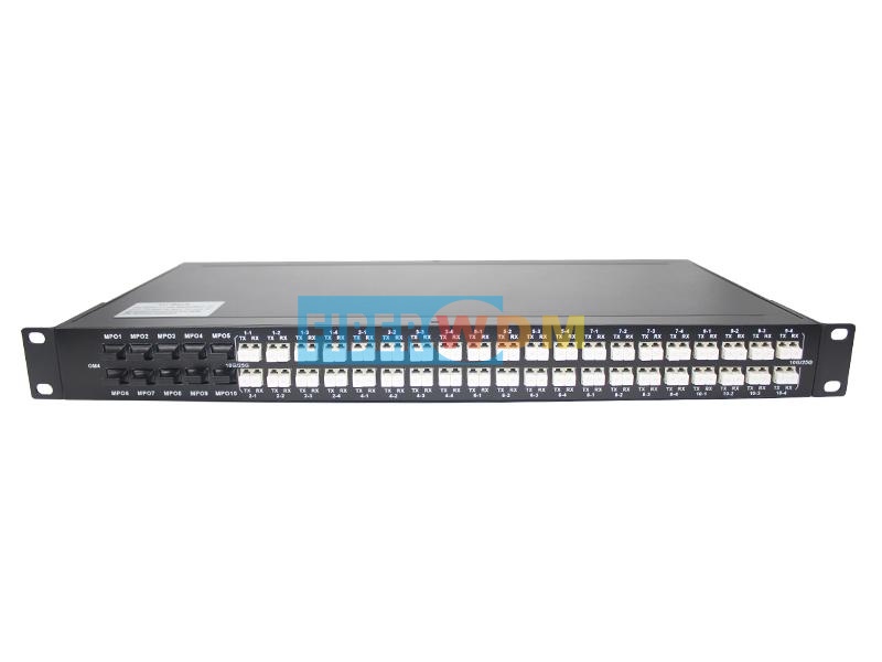 يوفر نظام Fiberwdm إمكانية تحويل موصلات MPO إلى موصلات LC مزدوجة، ويدعم تحويل 10 موصلات MPO بسرعة 40/100 جيجابت في الثانية إلى 40 موصل LC مزدوج بسرعة 10/25 جيجابت في الثانية. يمكن أن يكون الجهاز أحادي النمط (SM) أو متعدد الأنماط (MM)، ويشغل وحدة رف واحدة (1U).