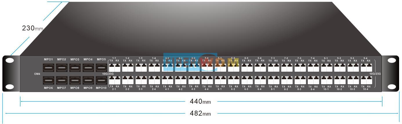 محول MPO إلى جهاز LC مزدوج، 10 × 40G/100G MPO/UPC إلى 40 × 10G/25G LC/UPC مزدوج، MM، وحدة رف 1U |