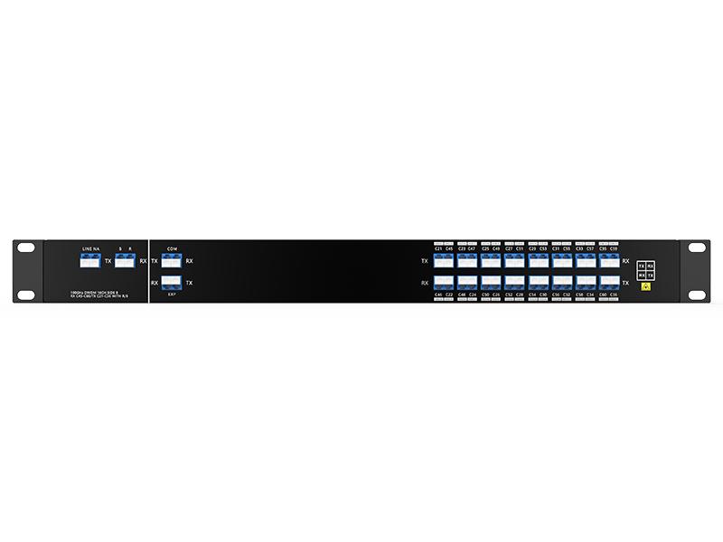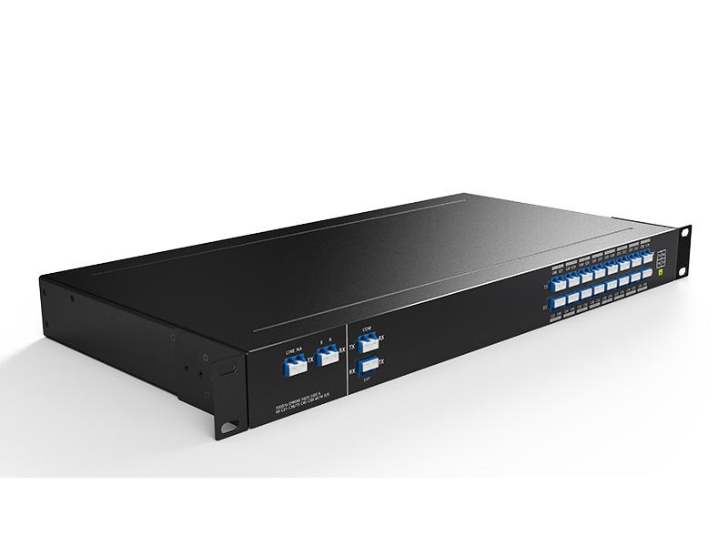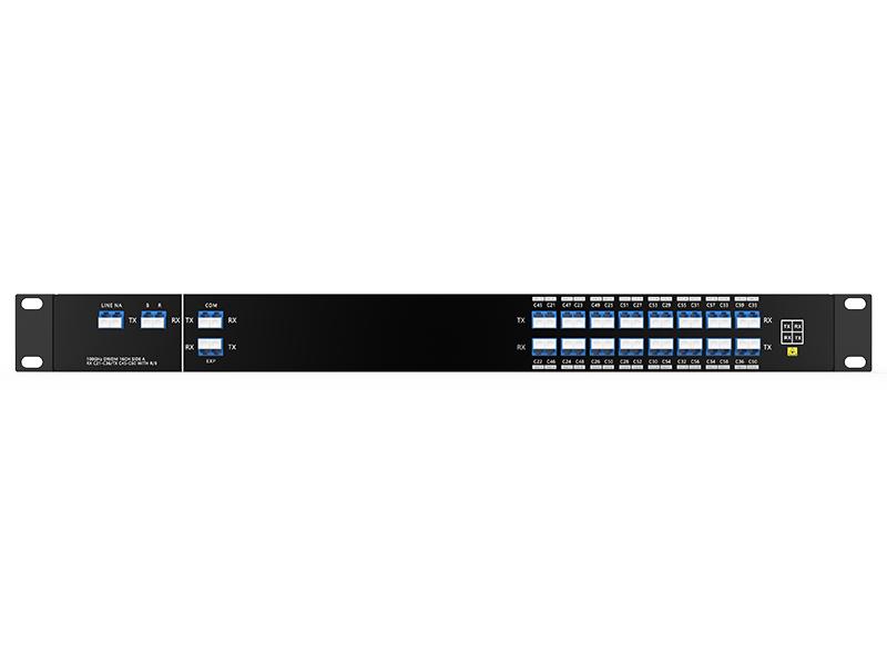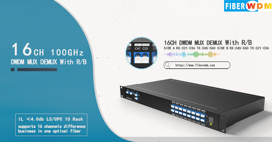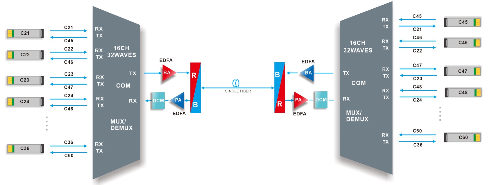 يُستخدم مُضاعِف/مُزيل الإرسال DWDM ذو 16 قناة (32 موجة) مع مرشح أزرق وأحمر (R/B) في أزواج، وهو من تصميم الألياف الضوئية بتقنية WDM في الجانب أ، تكون الموجات كالتالي: RX C21 إلى C36 (1560.61 نانومتر ~ 1548.51 نانومتر)، TX C45 إلى C60 (1541.35 نانومتر ~ 1529.55 نانومتر)؛ وفي الجانب ب، تكون الموجات كالتالي: RX C45 إلى C60 (1541.35 نانومتر ~ 1529.55 نانومتر)، TX C21 إلى C36 (1560.61 نانومتر ~ 1548.51 نانومتر). وبالاقتران مع مضخمات DWDM وجهاز DCM، يمكن لنظام نقل DWDM ذي 20 قناة دعم الإرسال لمسافات طويلة عبر ليف ضوئي واحد.