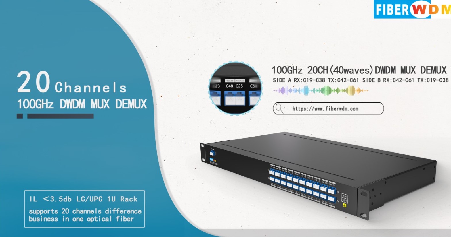 يبلغ فقد الإدخال في جهاز DWDM MUX/DEMUX ذي 20 قناة أقل من 3.5 ديسيبل (فقد الخط أقل من 7 ديسيبل)، وهو جهاز DWDM سلبي تمامًا، يدعم 20 قناة مختلفة في ليف بصري واحد للإرسال من نقطة إلى نقطة، لذلك فهو يستخدم على نطاق واسع في المجالات التي تفتقر إلى موارد الألياف البصرية، مثل البث التلفزيوني، ومراكز البيانات، والقطاع المالي، والحكومة، والحوسبة السحابية، والبيانات الضخمة، وغيرها من الصناعات.
