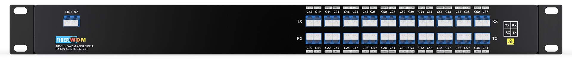 مُضاعِف/مُزيل إرسال DWDM، 20 قناة، 40 موجة (استقبال C19-C38/ إرسال C42-C61)، ألياف ضوئية مفردة، LC/UPC، وحدة رف 1U، الجانب أ |