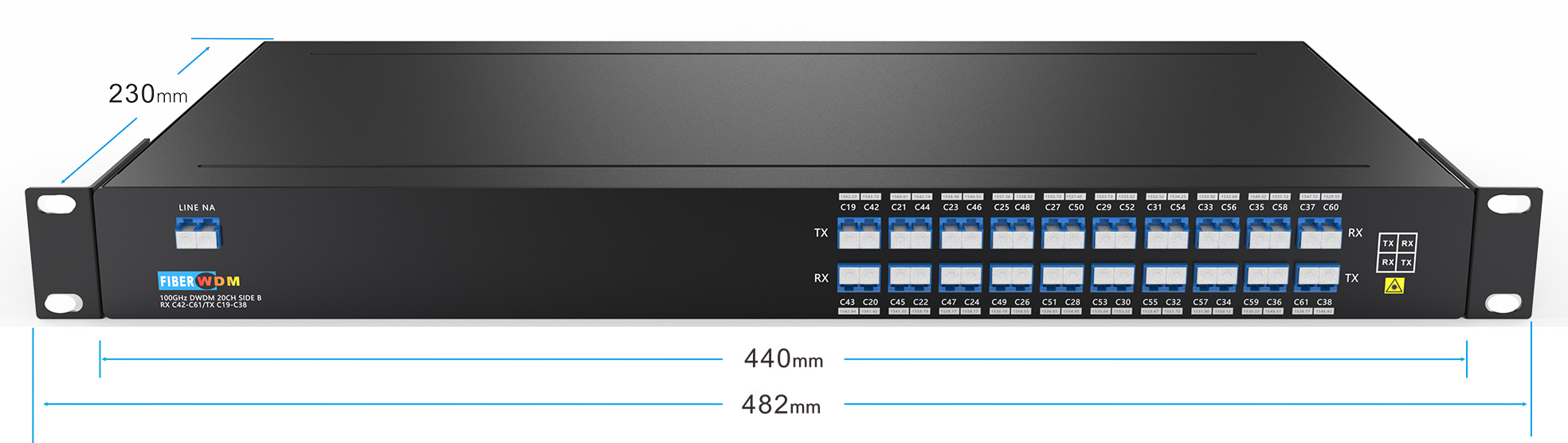 جهاز DWDM MUX/DEMUX ذو 20 قناة، يدعم نقل البيانات عبر 20 قناة مختلفة في نقل ثنائي الاتجاه من نقطة إلى نقطة عبر ألياف بصرية واحدة.