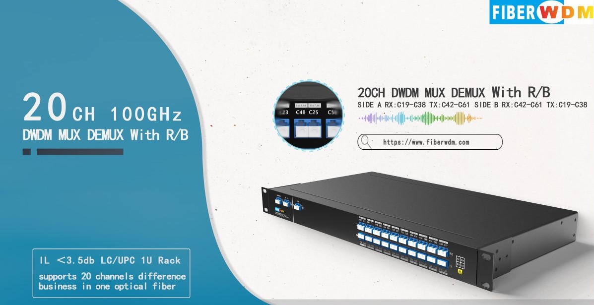 يُستخدم مُضاعِف/مُزيل إرسال DWDM ذو 20 قناة (40 موجة) مع مُرشِّح أزرق وأحمر (R/B) في أزواج، وهو من تصميم FIBERWDM. في الجانب A، تكون الموجات كالتالي: RX C19 إلى C38 (1562.23 نانومتر ~ 1546.92 نانومتر)، TX C42 إلى C61 (1543.73 نانومتر ~ 1528.77 نانومتر). وفي الجانب B، تكون الموجات كالتالي: RX C42 إلى C61 (1543.73 نانومتر ~ 1528.77 نانومتر)، TX C19 إلى C38 (1562.23 نانومتر ~ 1546.92 نانومتر). وبالاقتران مع مُضخِّمات DWDM وجهاز DCM، يُمكن لنظام نقل DWDM ذو 20 قناة دعم الإرسال لمسافات طويلة عبر ليف ضوئي واحد.