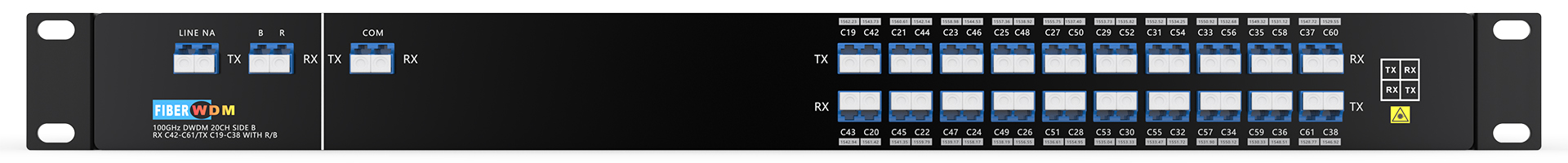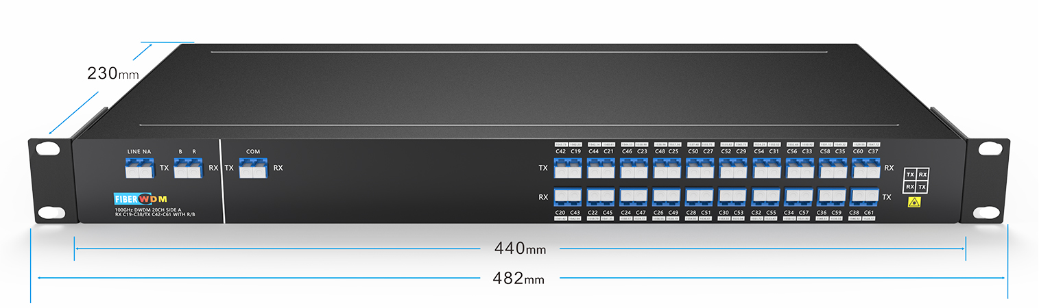 مُضاعِف/مُزيل إرسال DWDM، 20 قناة، 40 موجة (استقبال C19-C38/ إرسال C42-C61) مع مُكوِّن R/B، ألياف ضوئية أحادية، LC/UPC، وحدة رف 1U، الجانب A |