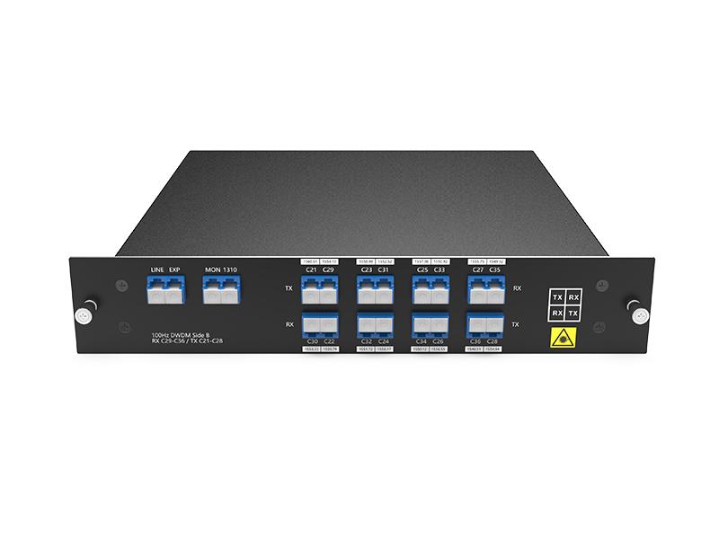يُستخدم مُضاعِف/مُزيل إرسال DWDM ذو 8 قنوات (16 موجة) في أزواج، وهو من تصميم FIBERWDM. في الجانب A، تكون الموجات كالتالي: RX من C21 إلى C28 (1560.61 نانومتر ~ 1554.94 نانومتر)، TX من C29 إلى C36 (1554.13 نانومتر ~ 1548.51 نانومتر). وفي الجانب B، تكون الموجات كالتالي: RX من C29 إلى C36 (1554.13 نانومتر ~ 1548.51 نانومتر)، TX من C21 إلى C28 (1560.61 نانومتر ~ 1554.94 نانومتر). وباستخدام مُضخِّمات DWDM وجهاز DCM، يُمكن لنظام نقل DWDM ذي 8 قنوات دعم الإرسال لمسافات طويلة عبر ليف ضوئي واحد.