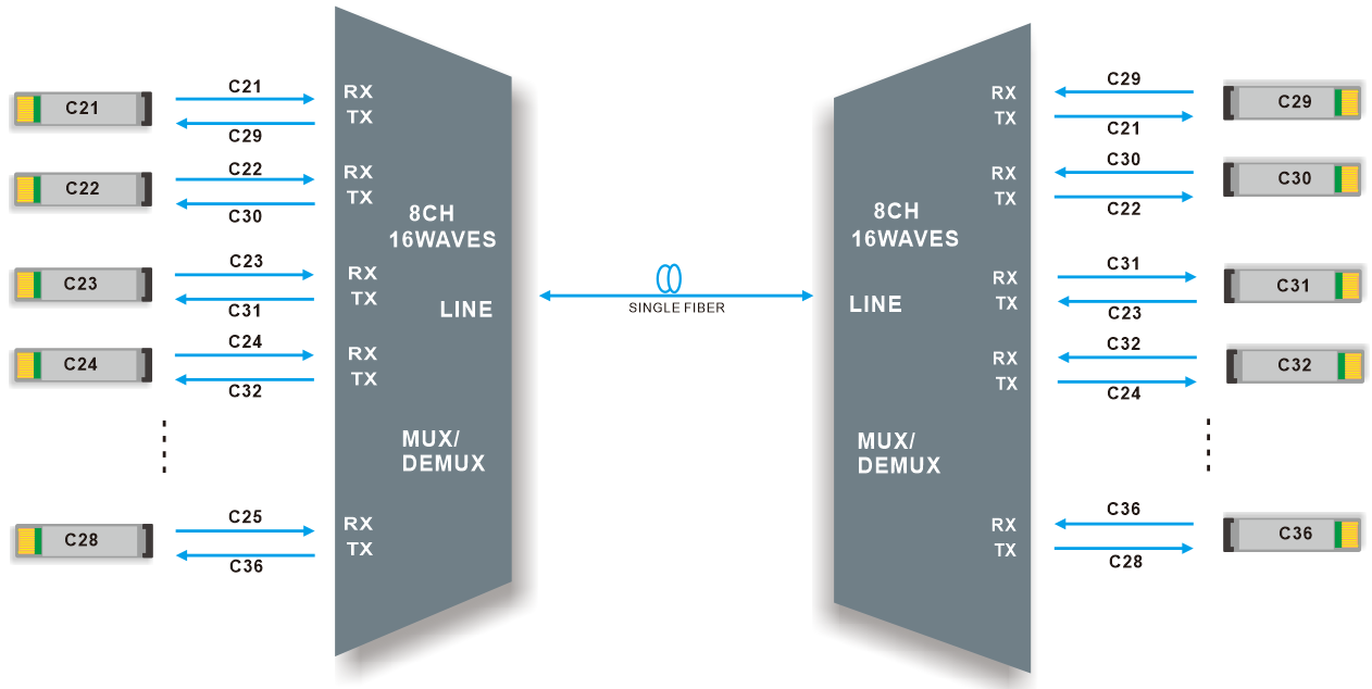 تم تصميم جهاز الإرسال والاستقبال DWDM MUX/DEMUX ذو 8 قنوات بواسطة FIBERWDM، بطول موجي من C21 إلى C36 (1560.61 نانومتر ~ 1548.51 نانومتر)، (بالمناسبة، يمكننا دعم تخصيص أطوال موجية أخرى)؛ وفقًا لشبكة ITU-T G.694.1 100 جيجاهرتز، فإنه يزيد من سعة نطاق النطاق C.