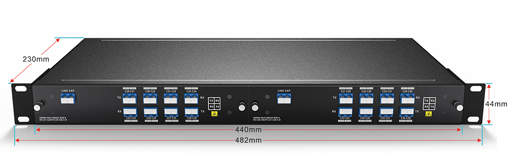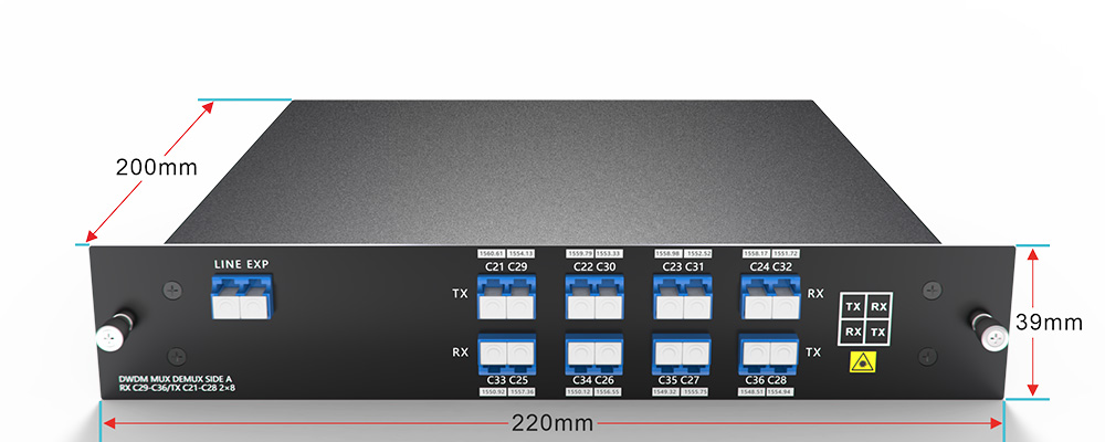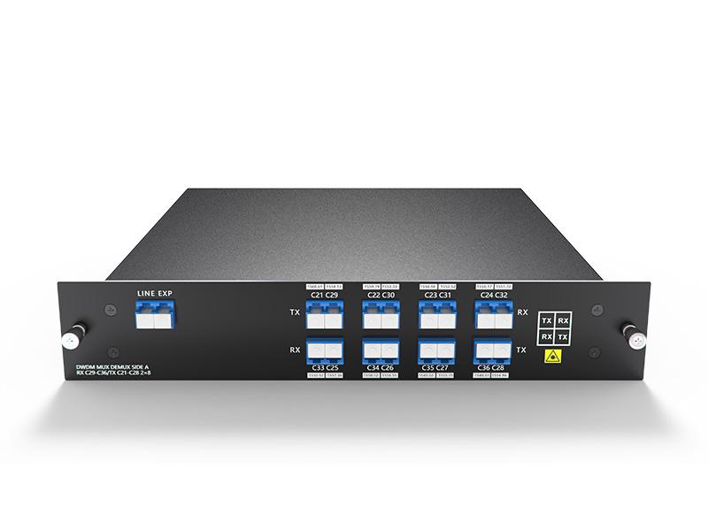 مُضاعِف/مُزيل إرسال DWDM أحادي الألياف 8 قنوات (16 موجة) C21-C36، مع منفذ EXP، وصندوق LC/UPC، وصندوق LGX، وفتحتين في رف 1U