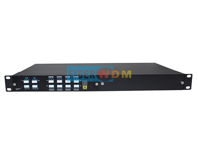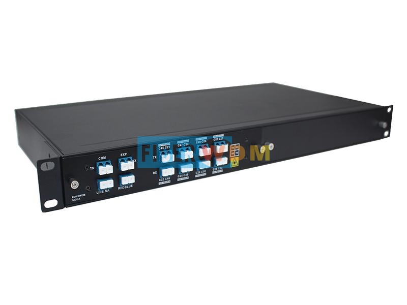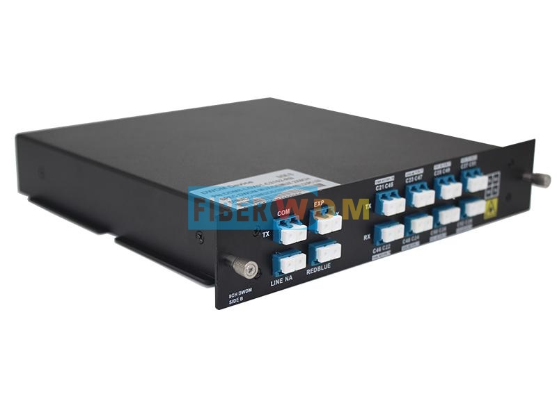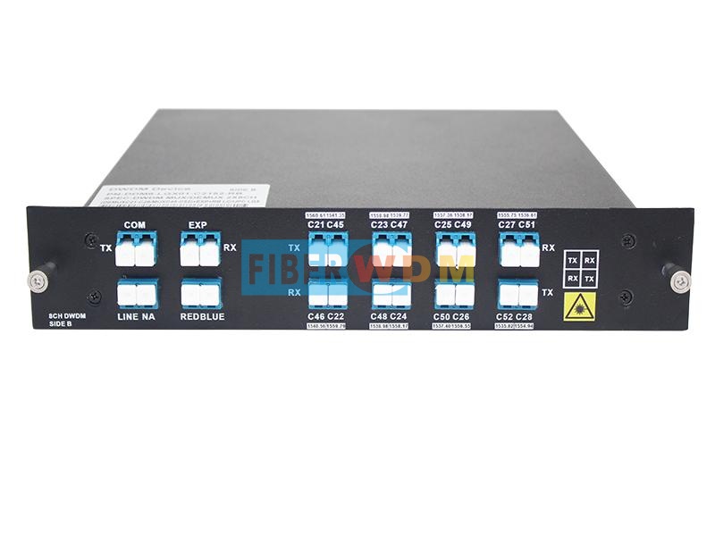 مُضاعِف/مُزيل إرسال DWDM أحادي الألياف 8 قنوات 16 موجة، مع منفذ توسعة، ومرشح R/B، وLC/UPC، وصندوق LGX قابل للتوصيل، وفتحتين في رف 1U
