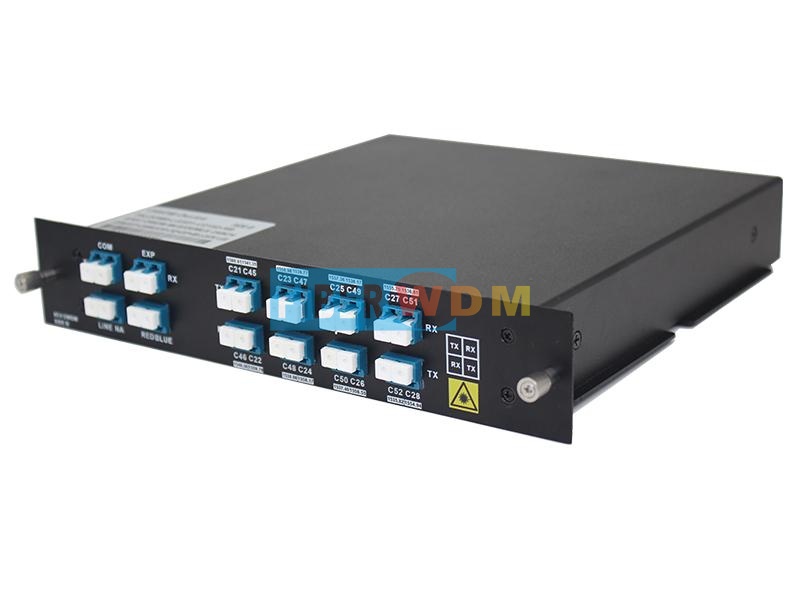 يُستخدم مُضاعِف/مُزيل إرسال DWDM ثماني القنوات (16 موجة) مع مُرشِّح أزرق وأحمر (R/B) في أزواج، وهو من تصميم FIBERWDM. في الجانب A، تكون الموجات كالتالي: RX من C21 إلى C28 (1560.61 نانومتر ~ 1554.94 نانومتر)، TX من C45 إلى C52 (1541.35 نانومتر ~ 1535.82 نانومتر)؛ وفي الجانب B، تكون الموجات كالتالي: RX من C45 إلى C52 (1541.35 نانومتر ~ 1535.82 نانومتر)، TX من C21 إلى C28 (1560.61 نانومتر ~ 1554.94 نانومتر). وباستخدام مُضخِّمات DWDM وجهاز DCM، يُمكن لنظام نقل DWDM ثماني القنوات دعم الإرسال لمسافات طويلة عبر ليف ضوئي واحد.