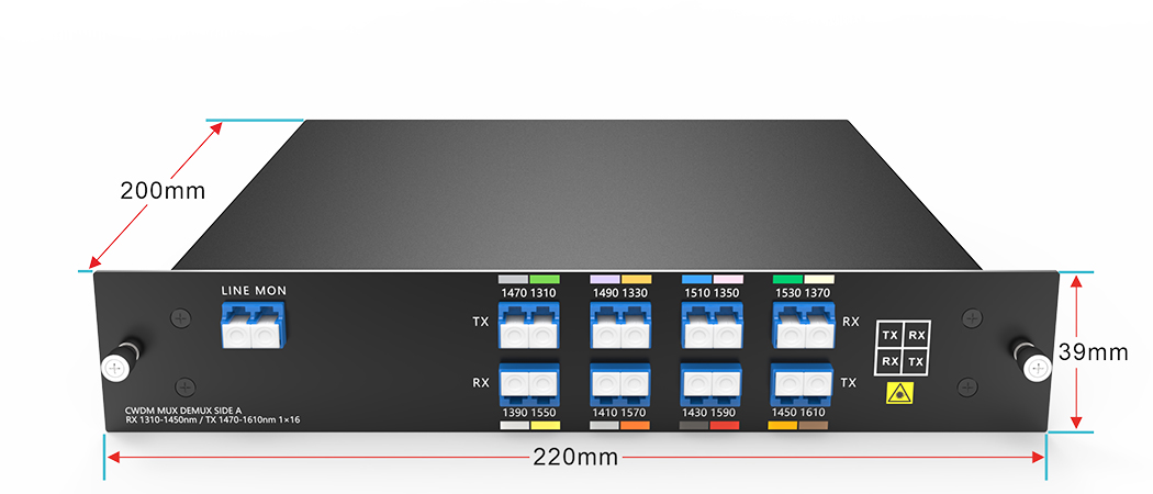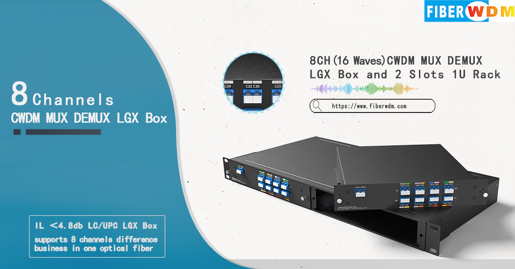 تم تصميم جهاز CWDM MUX DEMUX أحادي الألياف ذو 8 قنوات (16 موجة) بواسطة FIBERWDM، موجات الجانب A هي: RX من 1310 نانومتر إلى 1450 نانومتر / TX من 1470 نانومتر إلى 1610 نانومتر، وموجات الجانب B هي: RX من 1470 نانومتر إلى 1610 نانومتر / TX من 1310 نانومتر إلى 1450 نانومتر؛ وهو جهاز CWDM سلبي وصندوق LGX قابل للتوصيل، ويمكن توصيله برف 1U ذي فتحتين، ويدعم 8 قنوات مختلفة في ليف بصري واحد لنقل ثنائي الاتجاه من نقطة إلى نقطة.