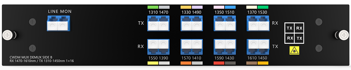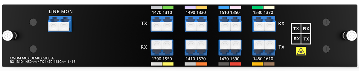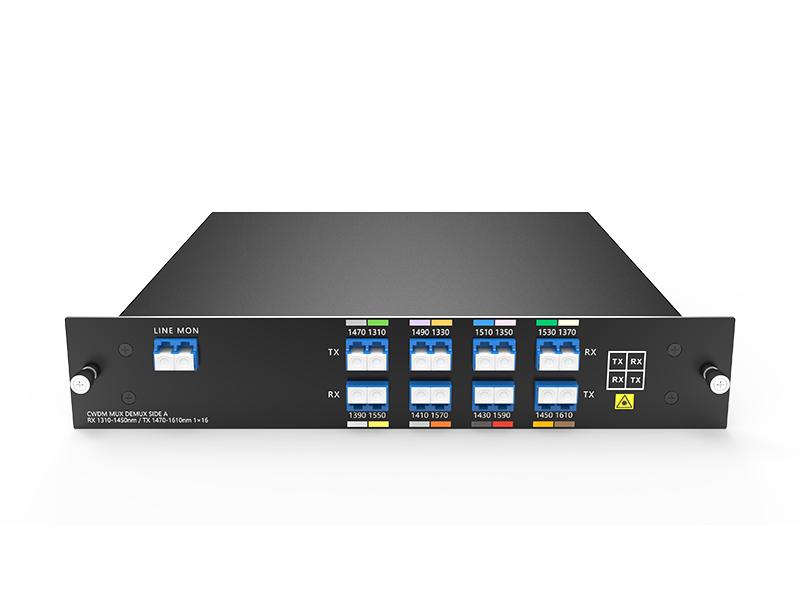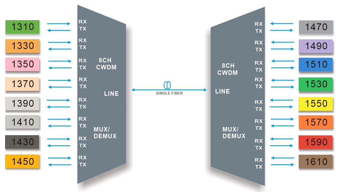 يجب استخدام مُضاعِف ومُزيل الإرسال CWDM ذو 8 قنوات (16 موجة) في أزواج، حيث يقوم بإرسال واستقبال أطوال موجية مختلفة، ويدعم 8 قنوات مختلفة للأعمال، مثل تطبيقات 1G/10G Ethernet وSDH/SONET و8/4/2/1G، في ليفتين بصريتين للإرسال من نقطة إلى نقطة.