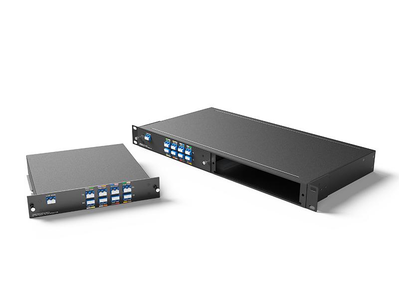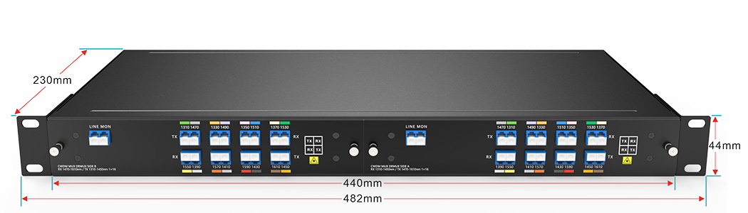 مُضاعِف/مُفكِّك إشارة CWDM أحادي الألياف بثمانية قنوات (16 موجة) بتردد 1310-1610 نانومتر، مزود بمنفذ مراقبة، وLC/UPC، وصندوق LGX قابل للتوصيل، وحامل 1U بفتحتين